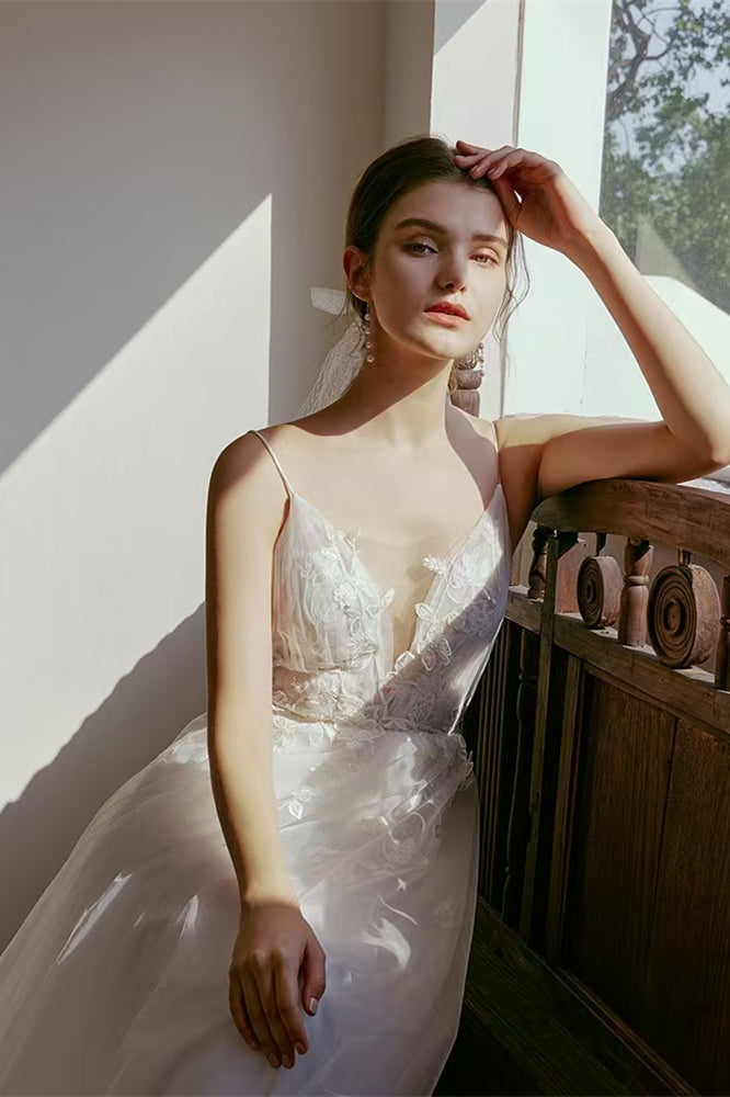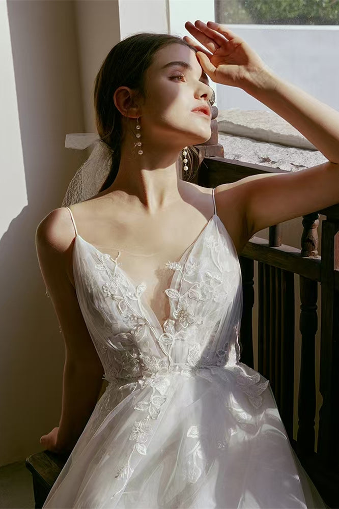 Spaghetti Long A-line Lace Tulle Wedding Dresses, Bridal Gown, Simple Wedding Dresses