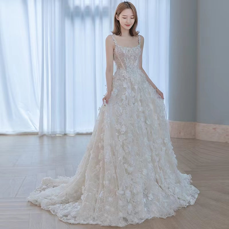 Straps Long A-line Wedding Dresses, Lace 3D Floral Wedding Dresses, Newest Luxury Handmade Wedding Dresses